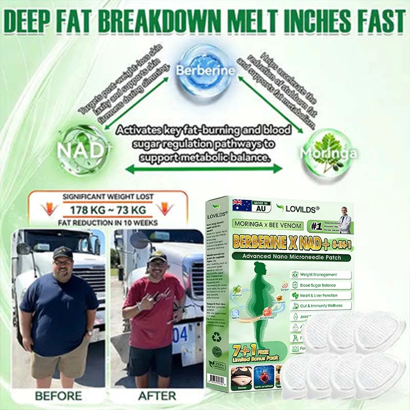 ✅ 𝐋𝐎𝐕𝐈𝐋𝐃𝐒® 𝐌𝐨𝐫𝐢𝐧𝐠𝐚 · 𝐁𝐞𝐞 𝐯𝐞𝐧𝐨𝐦 · 𝐁𝐞𝐫𝐛𝐞𝐫𝐢𝐧𝐞 × 𝐍𝐀𝐃+ 𝟖-𝐢𝐧-𝟏 𝐀𝐝𝐯𝐚𝐧𝐜𝐞𝐝 𝐍𝐚𝐧𝐨 𝐌𝐢𝐜𝐫𝐨𝐧𝐞𝐞𝐝𝐥𝐞 𝐏𝐚𝐭𝐜𝐡 breaking away from the burden of traditional injectable or oral weight-loss products, this advanced nano microneedle transdermal delivery system gently and steadily releases active ingredients for up to 8 hours. Core ingredients Moringa and Berberine work synergistically to support appetite management and lipid metabolism, making fat loss feel more natural and effortless—without extreme dieting or physical strain. At the same time, NAD⁺ supports cellular energy levels and skin firmness, helping maintain a healthy, well-toned appearance during body-weight changes. The overall formula is gentle and stable, offering a more comfortable experience for those seeking an effective, non-irritating, and non-injectable approach to weight management.