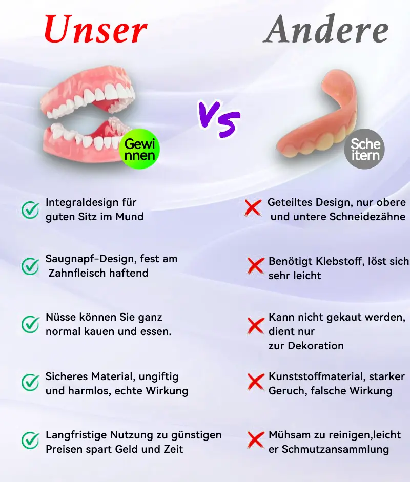 ๐ Einfache Passform, nahtloser Komfort:ย Freuen Sie sich รผber Zahnprothesen, die sich vom ersten Moment an perfekt an Ihren Mund anpassen. Unser hochmodernes Design sorgt fรผr eine bequeme und sichere Passform und bietet auรergewรถhnlichen Komfort, der sich wie ein natรผrlicher Teil Ihres Mundes anfรผhlt. Sie kรถnnen Ihren Tag selbstbewusst und ohne Beschwerden oder Verrutschen verbringen und ohne รrger oder Sorgen essen, sprechen und lรคcheln.