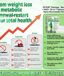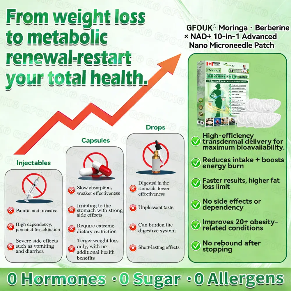 GFOUKยฎ ๐ด๐๐๐๐๐๐ฎ ยท ๐๐ฒ๐ฟ๐ฏ๐ฒ๐ฟ๐๐ฃ๐ ร ๐๐ผ๐+ ๐๐-๐ข๐ง-๐ ๐๐ฑ๐๐ฎ๐ป๐ฐ๐๐ ๐๐๐ฃ๐ค ๐๐๐๐ง๐ค๐ฃ๐๐๐๐ฅ๐ ๐๐๐ญ๐๐ was developed through more thanย 20 years of research by a multidisciplinary team of over 30 experts. Each patch incorporates an ultra-fine microneedle architecture measuring approximatelyย one-seventh the thickness of a human hair, designed to ensure a smooth and virtually painless application. The formulation containsย highly concentrated natural bioactive compounds, up to 20-fold higher than conventional market levels, includingย Moringa and Berberine, which act synergistically to support healthy glycemic responses, appetite regulation, and lipid metabolism, thereby promotingย gradual and sustainable weight management. Enriched withย NAD+, the patch further supportsย skin firmness and structural resilience during body-weight fluctuations, helping maintain a lean appearance without compromising comfort or aesthetics. Additional high-efficacy components contribute to the support ofย immune function, digestive health, gut balance, womenโs health, daily energy levels, and fatigue reduction, collectively promoting a more youthful and resilient physiological state from within. Manufactured inย facilities that comply with both U.S. and EU quality standards, thisย needle-free, science-driven solutionย provides aย safe and comprehensive approach to effective weight management and long-term metabolic health, designed to workย in harmony with the body rather than against it.