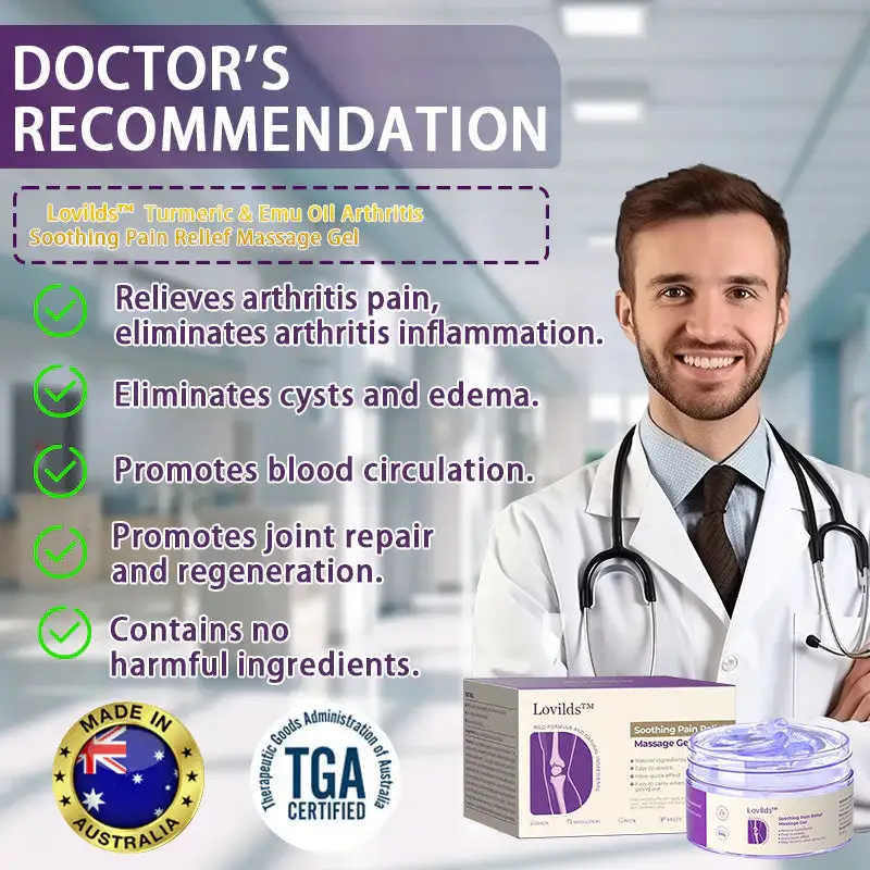 Approved by orthopedic specialists, Lovildsโข Turmeric & Emu Oil Arthritis Pain Relief Massage Gel delivers fast relief, soothing pain in just 3 minutes. It restores joint mobility within 3 days and supports full arthritis recovery in just 7 days. Formulated with natural anti-inflammatory ingredients like organic turmeric and pure emu oil, this gel penetrates deeply to reduce inflammation, lubricate joints, and promote long-term healing. Clinically proven and easy to use, itโs the ultimate solution for arthritis sufferers seeking quick relief and lasting recovery.