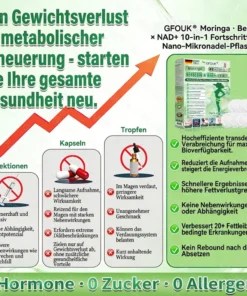 GFOUK® 10-in-1 Nano-Mikronadel-Patch ist das Ergebnis von über 20-jähriger Forschung und Entwicklung durch mehr als 30 Experten. Er wurde speziell für alle mittelaltrigen, älteren und übergewichtigen Personen entwickelt. Dieses Produkt nutzt die nanoskalige Mikronadeltechnologie, um sicherzustellen, dass die Wirkstoffe effektiv und schmerzfrei bis zu den Zellen vordringen. Seine fortschrittliche Formel enthält hochkonzentrierte natürliche Wirkstoffe wie Berberin, Moringa, die synergistisch wirken, um die Blutzuckerstabilisierung, Appetitregulation und Fettstoffwechsel zu unterstützen – und so einen schrittweisen und nachhaltigen Gewichtsmanagement-Prozess zu ermöglichen. NAD+ und Kollagenpeptide helfen dabei, die Hautfestigkeit und -elastizität während des Gewichtsverlusts zu erhalten, sodass du beim Abnehmen nicht nur gut, sondern auch toll aussiehst und dich fühlst. Weitere natürliche Inhaltsstoffe unterstützen die Immunfunktion, Verdauung, Darmbalance, Frauen Gesundheit, tägliche Energielevel und Ermüdungsbekämpfung – und helfen dir so, von innen heraus jugendliche Vitalität zurückzugewinnen. Dieses Produkt wird in einer GMP-zertifizierten Anlage hergestellt, die den Qualitätsstandards der USA und EU entspricht, und bietet somit eine bequeme, schmerzlose und wissenschaftlich fundierte Lösung für sicheren und umfassenden Gewichtsmanagement sowie langfristige Gesundheit.