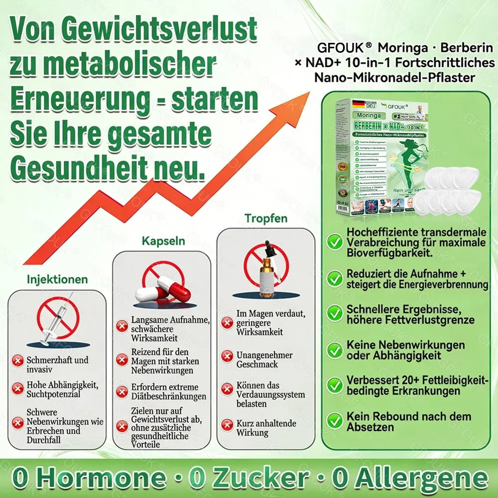 ✅ GFOUK®𝑴𝒐𝒓𝒊𝒏𝒈𝗮 · 𝗕𝗲𝗿𝗯𝗲𝗿𝙞𝙣𝙚 × 𝙉𝘼𝐃+ 𝟏𝟎-𝐢𝐧-𝟏 𝗔𝗱𝘃𝗮𝗻𝗰𝙚𝙙 𝙉𝙖𝙣𝙤 𝙈𝙞𝙘𝙧𝙤𝙣𝙚𝙚𝐝𝐥𝐞 𝐏𝐚𝐭𝙘𝙝 – Schluss mit der Belastung durch herkömmliche injizierbare oder orale Gewichtsabnahmemittel Dieses Produkt nutzt ein fortschrittliches transdermales Nano-Mikronadel-System, das die Wirkstoffe sanft und gleichmäßig über bis zu 8 Stunden freisetzt. Die Hauptwirkstoffe Moringa und Berberin wirken synergistisch, um die Appetitregulation und den Fettstoffwechsel zu unterstützen. So fühlt sich Fettabbau natürlicher und müheloser an – ohne extreme Diäten oder körperliche Anstrengung. Gleichzeitig unterstützt NAD⁺ den Energiehaushalt der Zellen und die Hautfestigkeit und trägt so zu einem gesunden, straffen Aussehen während Gewichtsschwankungen bei. Die Formel ist insgesamt sanft und stabil und bietet eine angenehmere Anwendung für alle, die eine effektive, reizfreie und nicht-invasive Methode zur Gewichtskontrolle suchen.