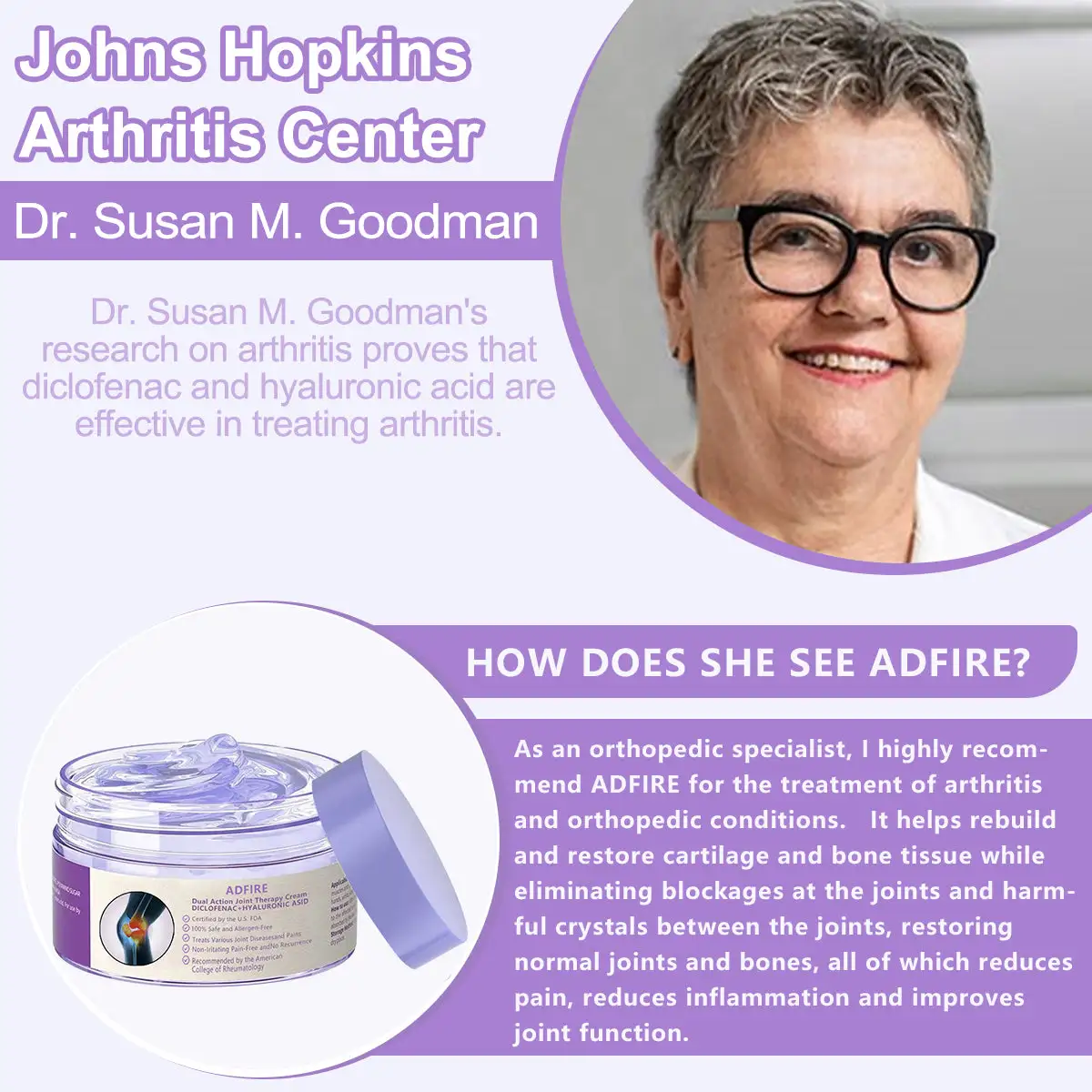 ADFIRE™ Dual Action Joint Therapy Cream is the first cream of its kind. combining the powerful anti-inflammatory and pain-relieving effects of diclofenac with the joint lubrication and repair benefits of hyaluronic acid. This groundbreaking formula is designed to provide unparalleled relief for joint pain. cartilage repair. and joint function. By fully utilizing the unique benefits of these two ingredients. ADFIRE™ Dual Action Joint Therapy Cream works faster and longer than either ingredient alone to effectively treat arthritis symptoms. improve joint mobility and protect joint health.