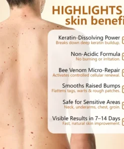 Raised skin formations such as skin tags, small warts, keratin bumps, friction-thickened patches, and dark rough spots all stem from the same root causes: an excessive buildup of keratin, where dead skin cells compact into hardened plugs, combined with chronic micro-inflammation triggered by friction, aging, hormonal changes, or repeated irritation. By targeting both the overproduction of keratin and the inflammation that drives abnormal skin growth, Timilk® BeeErase delivers a deeper, more effective correction than acid peels or freezing treatments, restoring the skin’s natural smoothness without pain or damage.