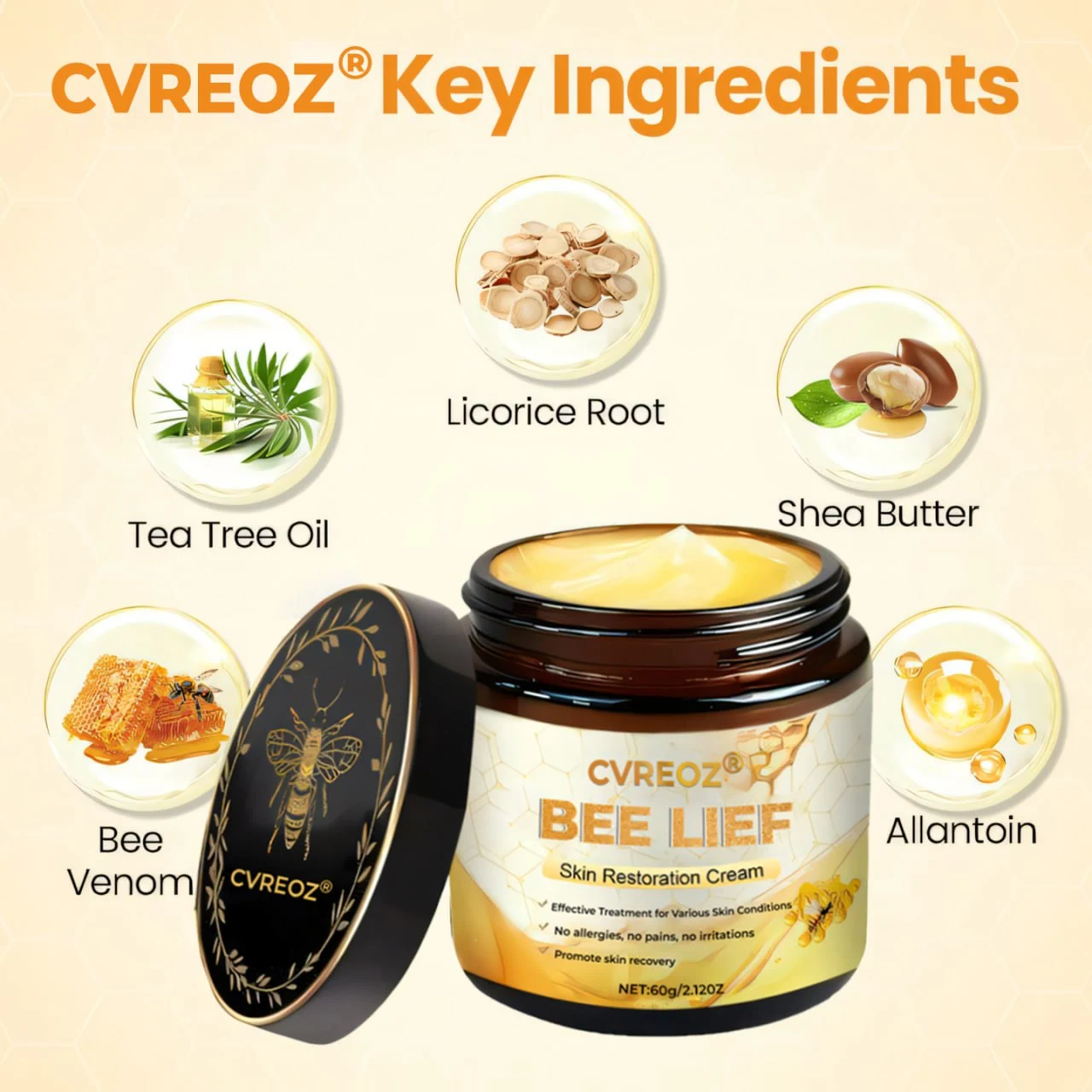 Cvreoz® BeeLief Psoriasis Skin Care Cream offers a natural, steroid-free alternative. Its key ingredient, bee venom peptides, helps block inflammation triggers while stimulating collagen production to repair and strengthen the skin. Combined with tea tree oil, licorice root extract, shea butter, and allantoin, it soothes irritation, prevents infections, deeply moisturizes, and restores the skin barrier—delivering lasting relief and promoting healthier, more resilient skin with continued use.