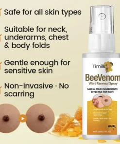 Timilk® BeeVenom Wart Renewal Spray supports the skin’s natural renewal process. Its bee venom–powered formula helps gradually soften hardened keratin buildup that forms warts and skin tags, while calming the surrounding skin and allowing raised areas to smooth and flatten over time—without burning or damaging healthy skin.
