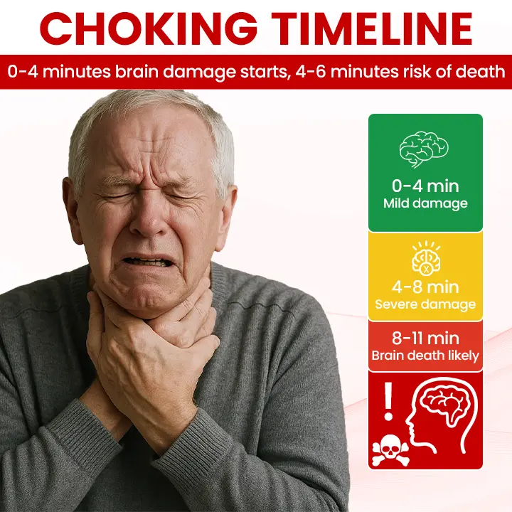 In the U.S., more than 5,000 people lose their lives to choking every year, with seniors facing the highest risks. As people age, they often experience weakened reflexes, dry mouth, ill-fitting dentures, swallowing difficulties, or live alone without anyone to help—factors that all increase the likelihood of choking. According to the National Safety Council, choking is the 4th leading cause of accidental death among seniors. And once choking occurs, you only have 4–6 minutes to act before irreversible brain damage begins. Yet, the average ambulance response time is 7–14 minutes, which means waiting for help is often too late. Every second counts—timely response can truly save a life.