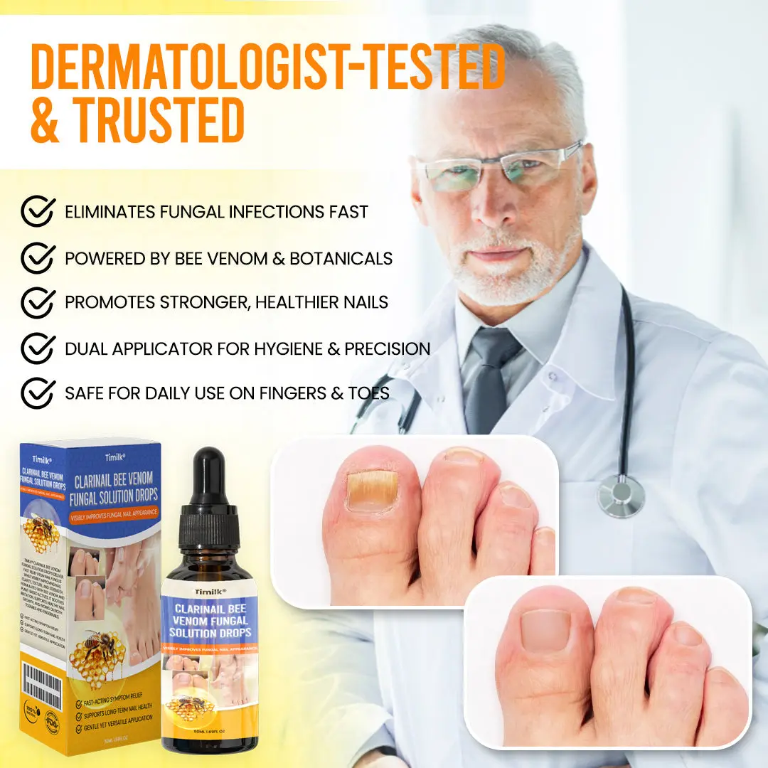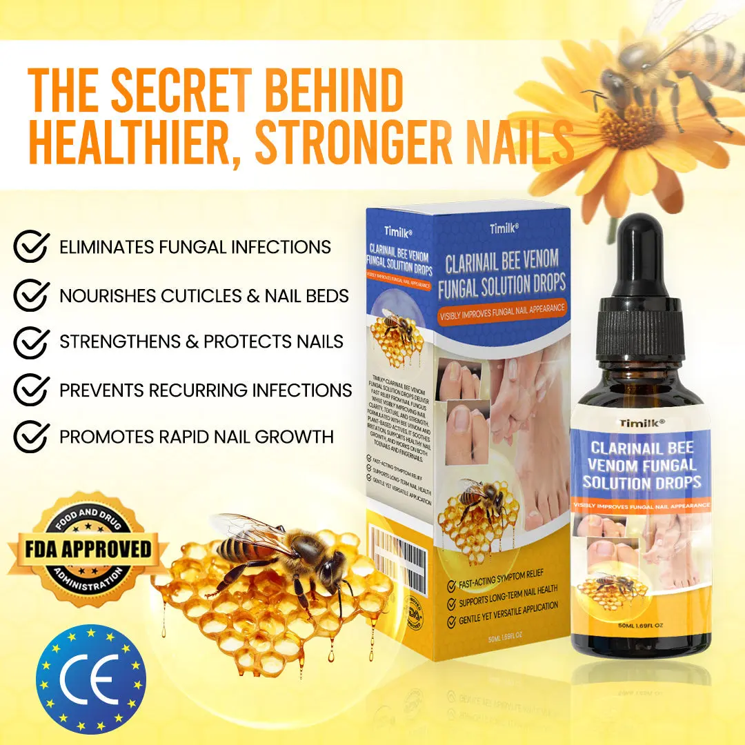Timilk® ClariNail Bee Venom Fungal Solution Drops have been carefully developed and tested to meet the highest standards in nail care. This advanced formula is specifically designed to combat fungal infections, restore nail clarity, and support healthy nail growth. Enriched with potent bee venom and natural plant extracts, it penetrates deeply to eliminate stubborn fungi, soothe irritation, and promote stronger, more resilient nails. With its powerful antifungal and antibacterial properties, ClariNail offers a safe, natural, and effective solution for achieving clear, healthy-looking nails.