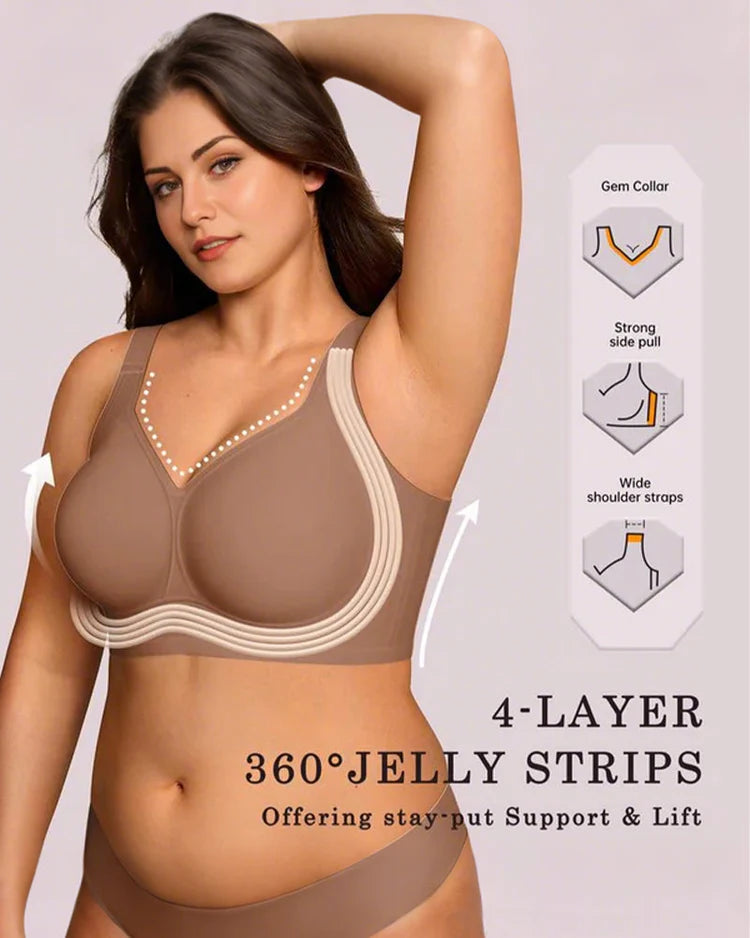 Engineered with 4-layer 360° jelly strips, this bra redefines wireless support. The flexible strips hug your curves, delivering gentle lift while keeping the bra firmly in place. No slipping, no shifting—just secure, long-lasting hold that adapts to every movement of your day.