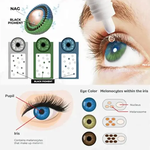 Clinical trials have shown that the product shows good eye color change effect in 94% of volunteers and is safe to use with no allergic reaction or irritation, complying with U.S. and European cosmetic safety standards. The mechanism of eye color change is mainly achieved by affecting the distribution of melanin in the iris.