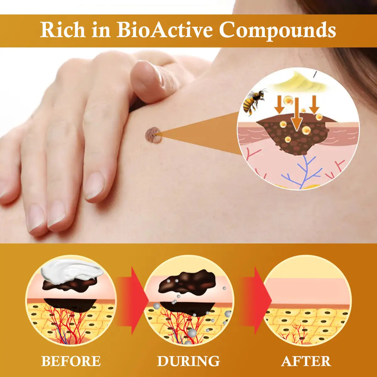 The cream uses natural venom, which contains peptides and enzymes to break down and remove unwanted skin growths, leading to improved skin texture and appearance.