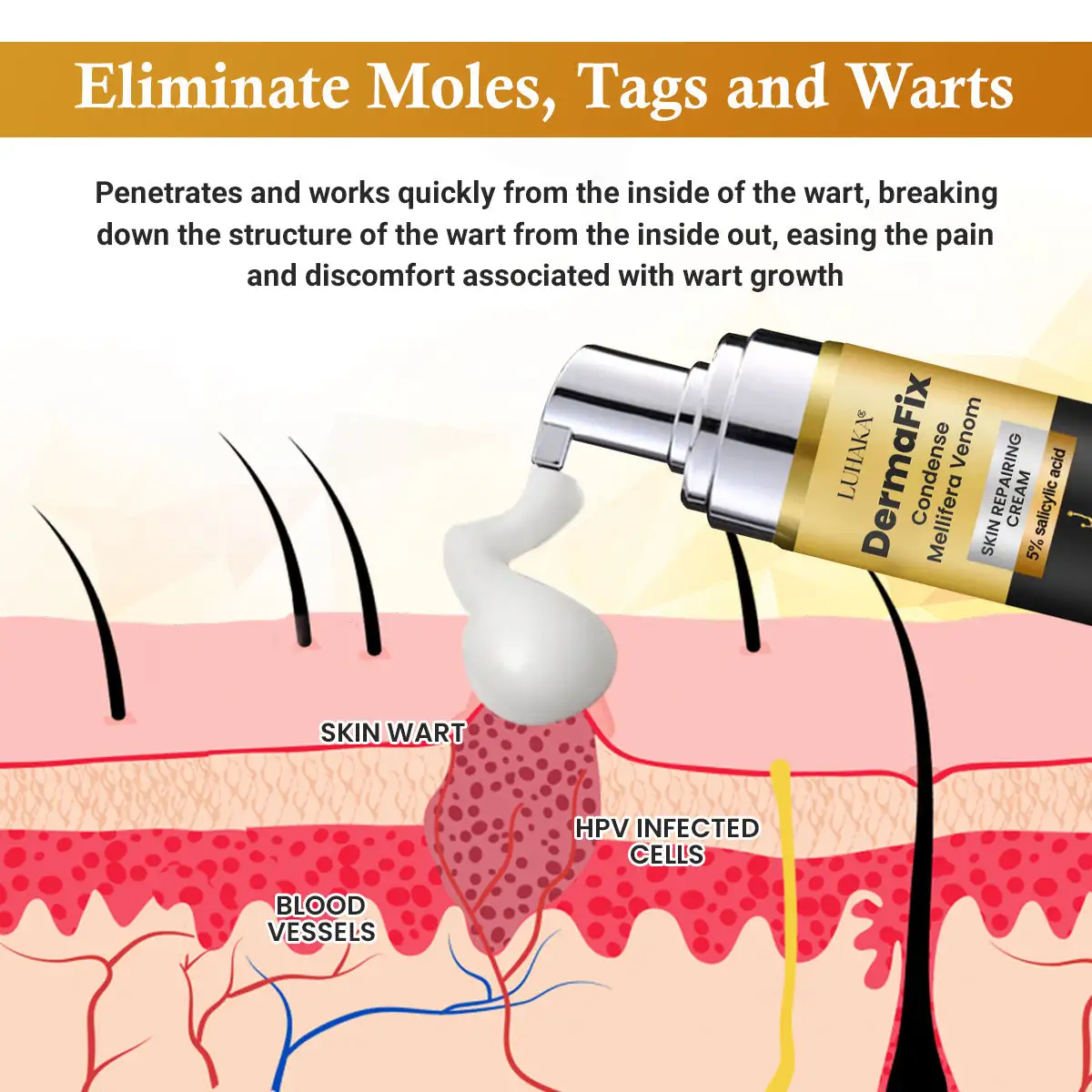 At Luhaka® DermaFix, we deliver advanced solutions to target and transform your skin, ensuring a flawless and healthy complexion. With Luhaka® DermaFix Condense Mellifera Venom Skin Repairing Cream, you can effectively address moles, warts, and other skin imperfections with advanced treatment. This cream combines powerful ingredients to enhance skin clarity, reduce visible growths, and improve overall skin health.