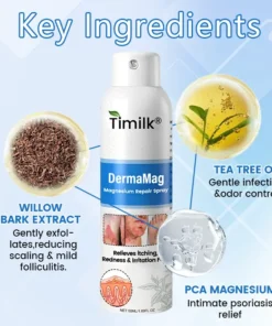 Timilk® DermaMag Magnesium Repair Spray offers targeted relief for skin and nail psoriasis with a gentle yet effective formula. Powered by PCA Magnesium Complex, Tea Tree Extract, and Chamomile, this advanced spray penetrates deeply to inhibit fungal growth and regulate excessive cell turnover—restoring your skin’s natural clarity and resilience.