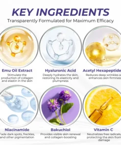 AEA-Certified Emu Oil Extract: The omega fatty acids in ethically-sourced emu oil stimulate the production of collagen and elastin in the skin. As we age, collagen gradually decreases, leading to sagging and wrinkles. Emu oil helps restore skin elasticity by promoting collagen production and penetrating 7x deeper than regular moisturizers, thereby reducing the formation of wrinkles.