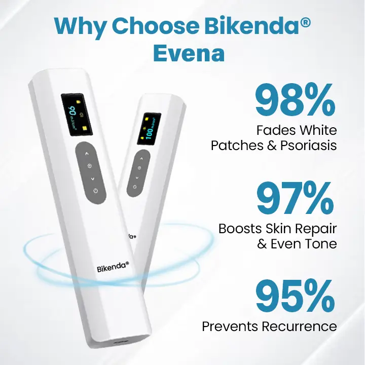 Unlike traditional treatments that require frequent clinic visits and long recovery times, Bikenda® Evena requires only a few minutes daily — with visible improvements in just weeks. Whether you’re looking to restore skin tone or manage recurring vitiligo symptoms, it offers a simple, effective, and affordable clinical solution at home.