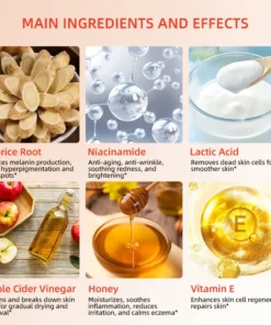 Licorice Extract, Niacinamide, Apple Cider Vinegar, Aloe Vera Extract, Honey, Lactic Acid, Tea Tree Oil, Vitamin C, Vitamin E, Lithospermum Extract, Shea Butter, Menthol, Goat’s Milk, Lemon, Oatmeal, Papaya, Rosehip Oil