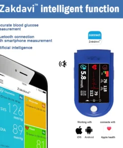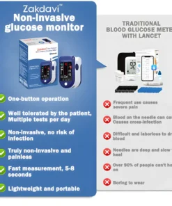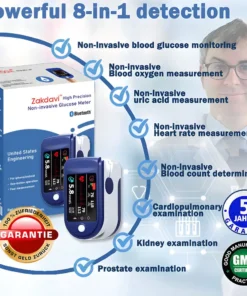 Zakdavi™’s latest innovation, the Smart Multifunctional Non-Invasive Laser Blood Glucose Meter, integrates state-of-the-art technologies for superior health monitoring. With an extremely energy-efficient smart MCU control chip and the advanced “LAMBERT BEER” algorithm, this device ensures highly accurate measurements. It combines photon chip technology and silicon with light absorption spectroscopy to provide reliable non-invasive monitoring of blood glucose, blood pressure and blood oxygen levels. Certified by BfArM, the device includes six display modes for easy and comprehensive health monitoring. Whether you are managing diabetes, monitoring cardiovascular health or tracking oxygen levels, Zakdavi™ offers a trusted, all-in-one solution for your health needs.
