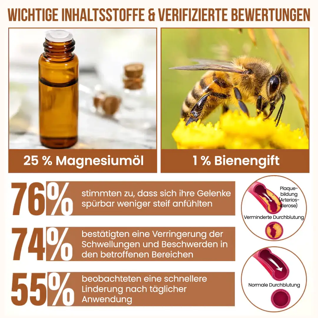 Powered by Apis venom (bee venom), rich in melittin and phospholipase A2, the spray gently reduces swelling, calms inflammation, and improves circulation in affected joints — providing relief within 24–48 hours.