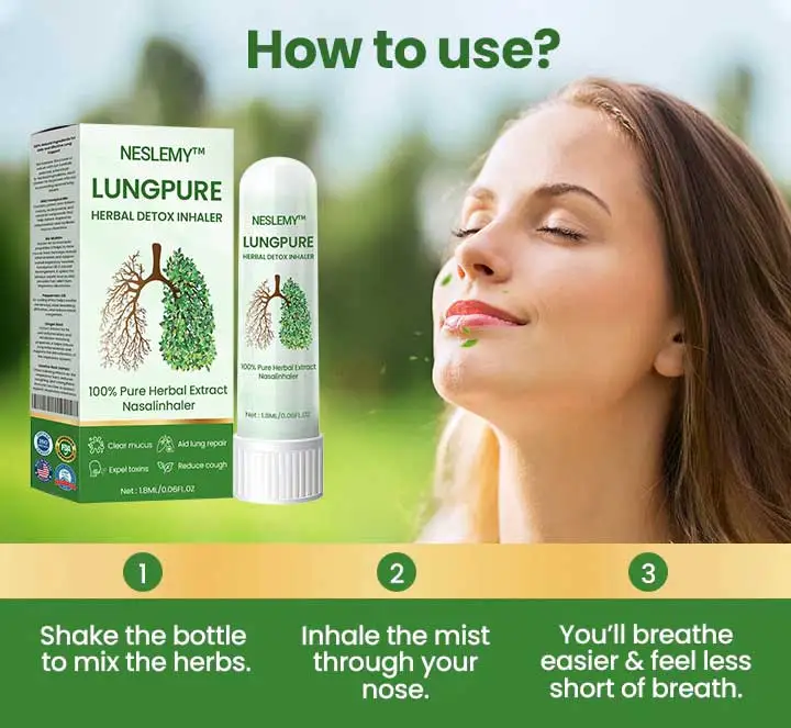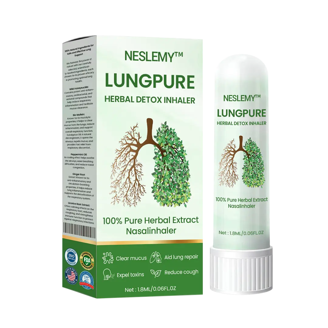 The NESLEMY™ LungPure Herbal Detox Inhaler uses advanced technology combined with natural ingredients to break down and remove toxins from your lungs. It works quickly to clear the mucus caused by smoking and air pollution, allowing your lungs to breathe freely again. The spray form ensures that the active ingredients are delivered directly to your airways, promoting a deep cleanse for your lungs.
