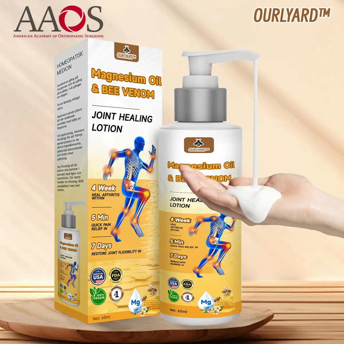 has been recommended by the AAOS. This product has undergone stringent quality testing and meets AAOS high standards, effectively relieving pain and promoting bone health. The AAOS recommendation reflects a high level of trust in the quality and safety of our product, allowing you to confidently choose our Ourlyard™ Magnesium Oil & Bee Venom Joint Healing Spray for reliable results and a comfortable experience.