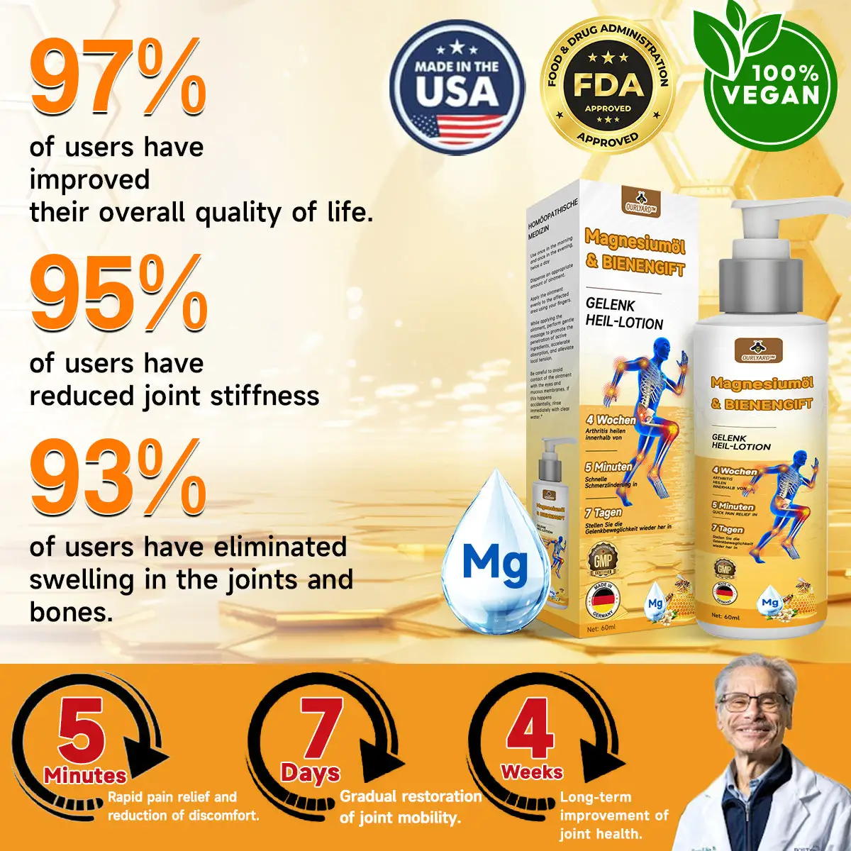 “As a doctor with extensive experience in joint disease research, I have gained valuable insights into the field of medicine. Although I am now retired, I continue to stay closely connected with the needs of patients. Through my interactions with many patients, I’ve noticed an increasing demand for natural, side-effect-free treatment options. This inspired me to develop a joint treatment cream combining magnesium oil and bee venom, with the goal of providing a safe, fast, and effective solution to help improve their quality of life.”