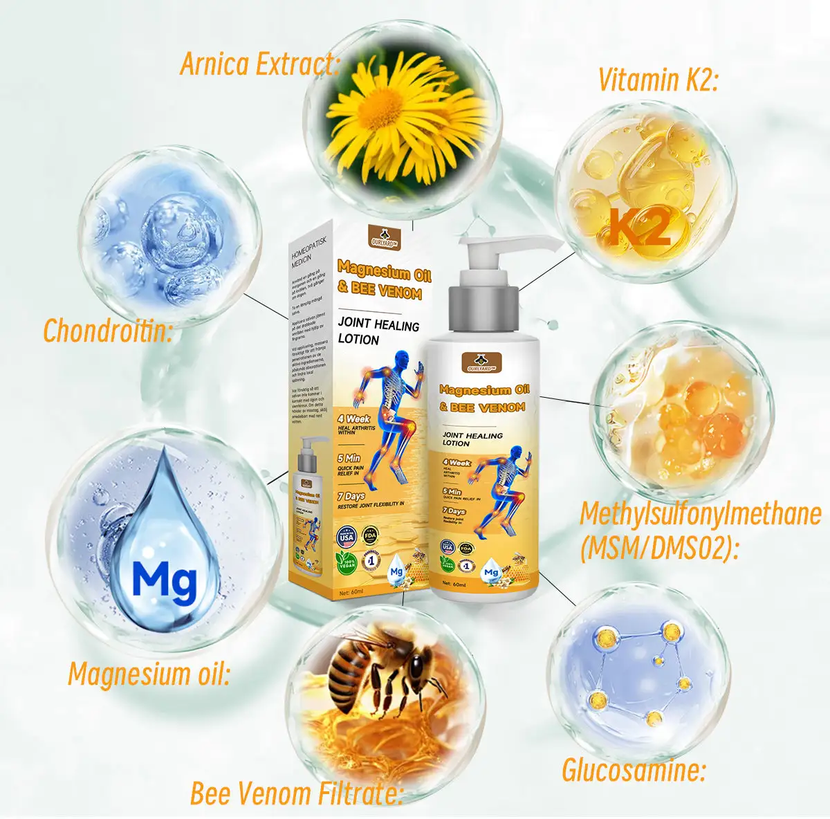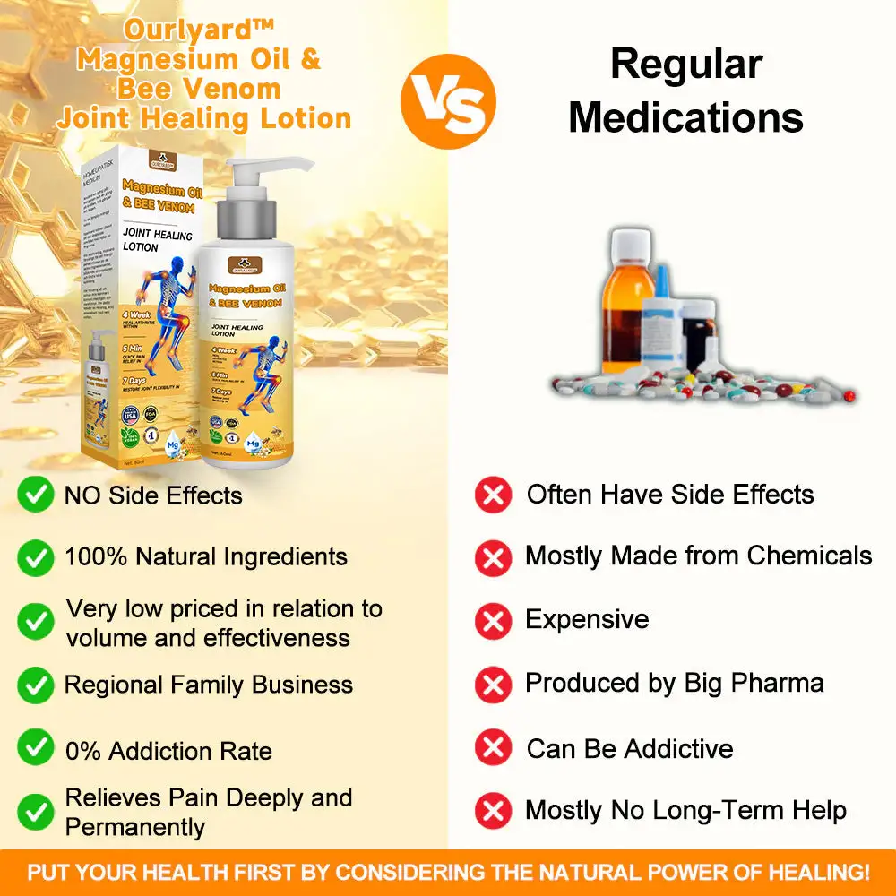 Ourlyard™ Magnesium Oil & Bee Venom Joint Healing Spray contains six proven, powerful ingredients that have been used to effectively treat arthritis and bone-related conditions in millions of people around the world.![Ourlyard™ Magnesium Oil & Bee Venom Joint Healing Lotion]()
