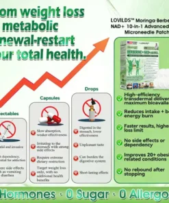 LOVILDSโข ๐ด๐๐๐๐๐๐ฎ ยท ๐๐ฒ๐ฟ๐ฏ๐ฒ๐ฟ๐๐ฃ๐ ร ๐๐ผ๐+ ๐๐-๐ข๐ง-๐ ๐๐ฑ๐๐ฎ๐ป๐ฐ๐๐ ๐๐๐ฃ๐ค ๐๐๐๐ง๐ค๐ฃ๐๐๐๐ฅ๐ ๐๐๐ญ๐๐ ย was developed through more than 20 years of research by a multidisciplinary team of over 30 experts. Each patch incorporates an ultra-fine microneedle architecture measuring approximately one-seventh the thickness of a human hair, designed to ensure a smooth and virtually painless application. The formulation contains highly concentrated natural bioactive compounds, up to 20-fold higher than conventional market levels, including Moringa and Berberine, which act synergistically to support healthy glycemic responses, appetite regulation, and lipid metabolism, thereby promoting gradual and sustainable weight management. Enriched with NAD+, the patch further supports skin firmness and structural resilience during body-weight fluctuations, helping maintain a lean appearance without compromising comfort or aesthetics. Additional high-efficacy components contribute to the support of immune function, digestive health, gut balance, womenโs health, daily energy levels, and fatigue reduction, collectively promoting a more youthful and resilient physiological state from within. Manufactured in facilities that comply with U.S. quality standards, this needle-free, science-driven solution provides a safe and comprehensive approach to effective weight management and long-term metabolic health, designed to work in harmony with the body rather than against it.