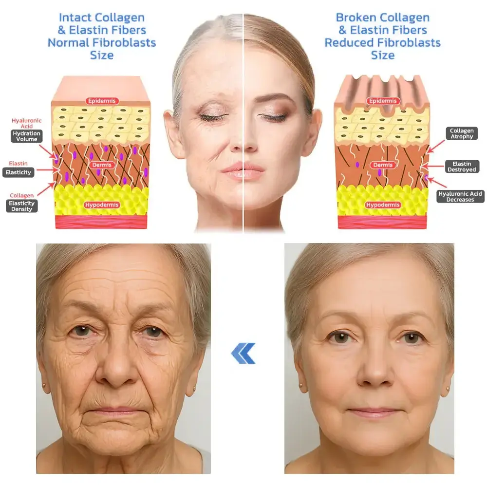 As we age, broken collagen and elastin fibers, along with reduced fibroblast size, are some of the key factors contributing to the formation of wrinkles and sagging skin. These structural components of the skin are essential for maintaining firmness, elasticity, and overall youthful appearance.