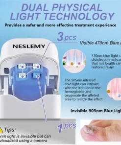 The NESLEMY Nail Fungus Cleaning Light Device uses advanced light therapy to effectively treat nail fungus by emitting a specific wavelength of light that penetrates the nail to target the infection beneath the surface. This non-invasive treatment neutralizes the fungus, reduces inflammation, and promotes healing without the need for harsh chemicals or medications. With consistent use, typically 1-2 times a day, the device helps restore the nails to their healthy, fungus-free state.