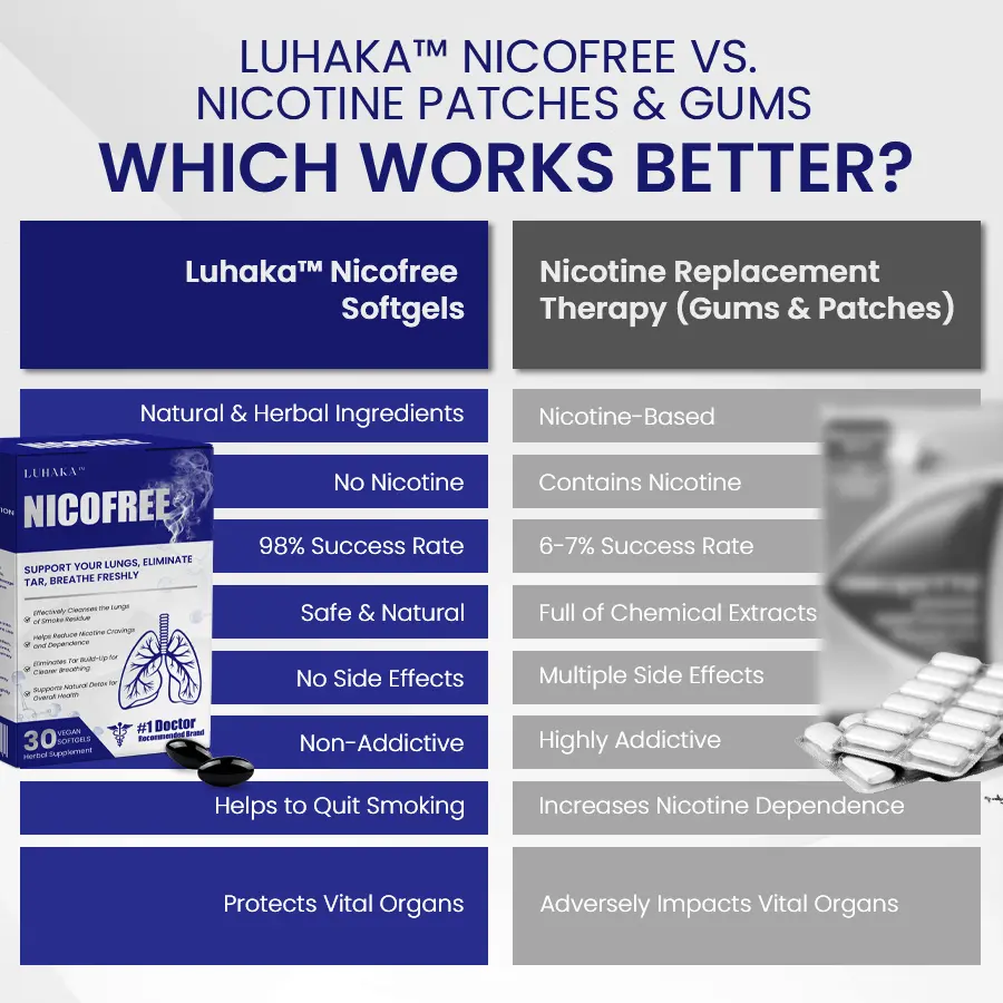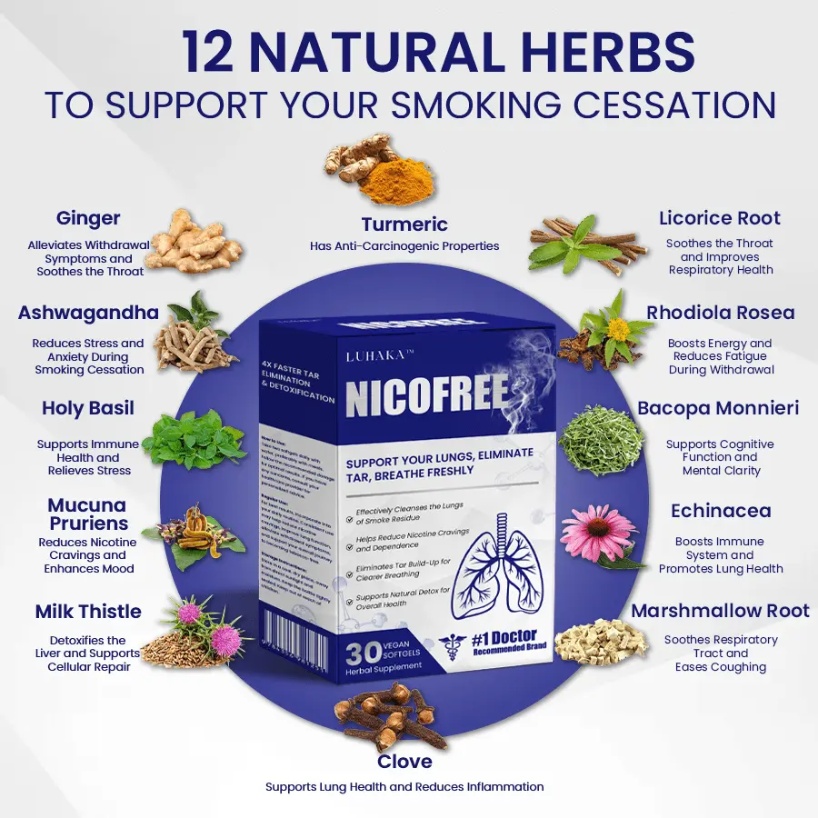 Luhaka™ Nicofree is a scientifically formulated natural supplement designed to help you quit smoking. Powered by a unique blend of herbal ingredients, it supports your body’s detox process, reduces nicotine cravings, and improves lung health. With advanced ingredients that work synergistically to alleviate withdrawal symptoms and promote overall wellness, Luhaka™ Nicofree offers a safer, effective way to break free from nicotine dependence and restore your body’s vitality.
