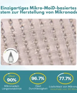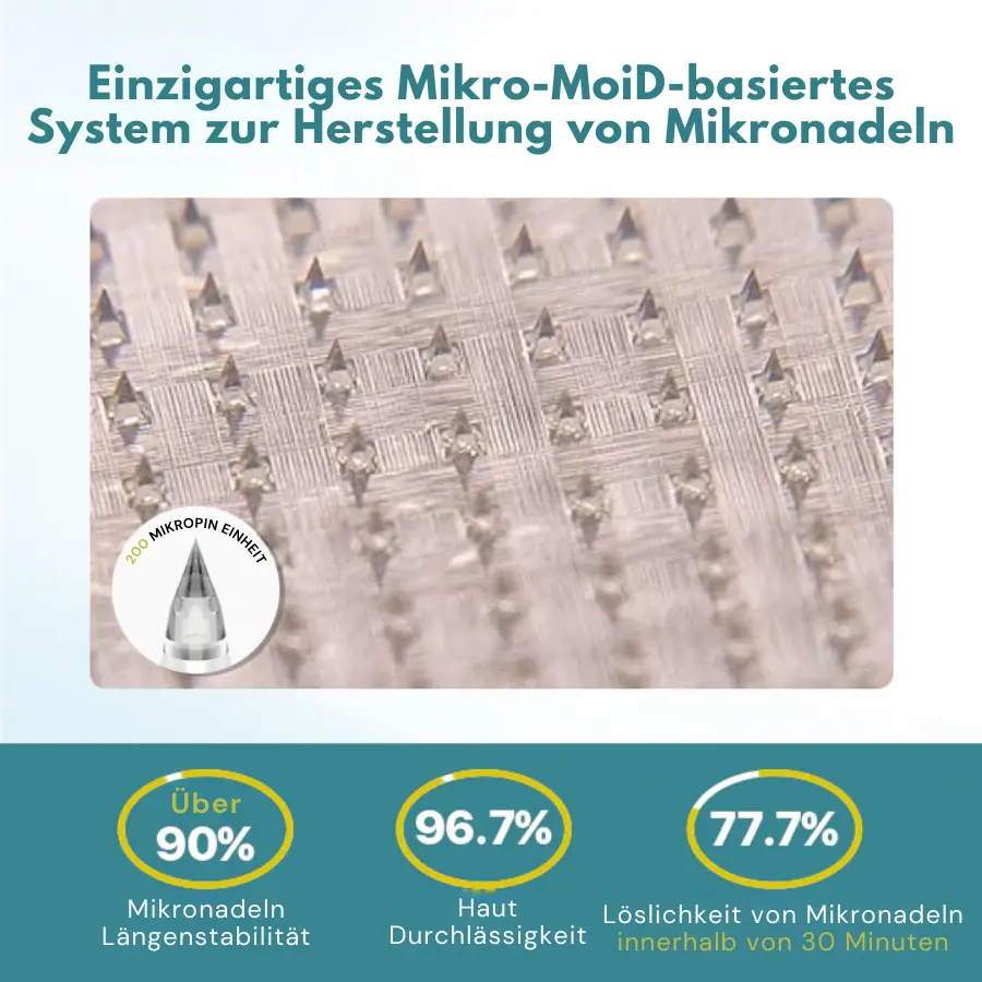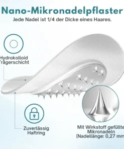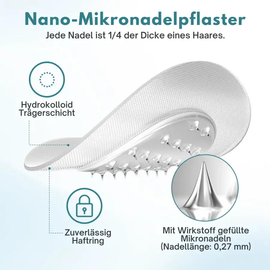 Das Fivfivgo®-Nanonadelpflaster der nächsten Generation verwendet eine fortschrittliche Technologie mit 0,27 mm großen Mikronadeln, die nur 1/7 der Dicke eines Haares haben und eine schmerzfreie Hautpenetration gewährleisten. Diese Mikronadeln geben lösliche Medikamente direkt in die Haut ab, um die Absorption und die therapeutische Wirkung zu optimieren und eine effiziente und komfortable Behandlung zu ermöglichen.