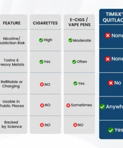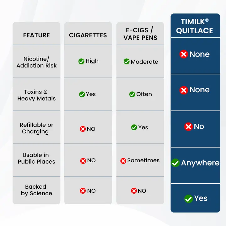 Freedom to Use Anywhere: Airports. Offices. Elevators. Even at dinner with your kids. Timilk® Quitlace is smoke-free, odorless, and fully travel-safe, letting you fight cravings anytime, anywhere — without judgment or side effects.