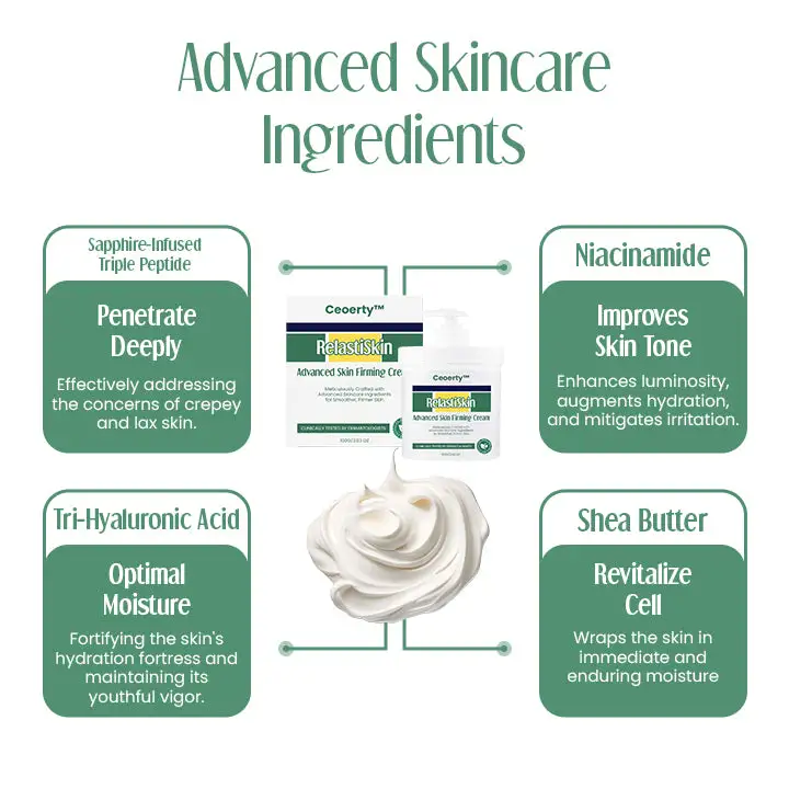 Ceoerty™ RelastiSkin Advanced Skin Firming Cream is the ultimate solution for those seeking youthful, rejuvenated skin. This advanced formula combines powerful firming agents with revitalizing ingredients to lift, tighten, and smooth your skin. Designed for all skin types, this targets sagging, fine lines, and wrinkles, leaving your skin visibly firmer and more radiant. Infused with nourishing antioxidants and moisture-locking compounds, it delivers long-lasting hydration while boosting your skin’s natural elasticity.