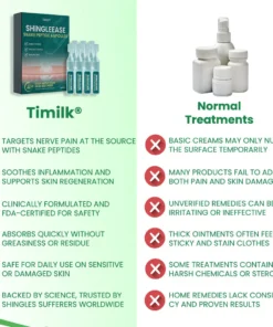 “Shingles pain had me at my limit—constant stinging and nerve discomfort. My wife found Timilk® ShingleEase Snake Peptide Ampoules, and I was skeptical, but after the first application, I felt the burning fade within seconds. Within a few days, my skin wasn’t just less painful, it looked healthier too. I like that it’s topical—no more pills that make me groggy. This really changed my quality of life.” – Michael T., 58, Ohio