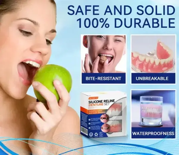 - Customizable Fit: Tailor-made silicone reline adjusts perfectly to your dentures.