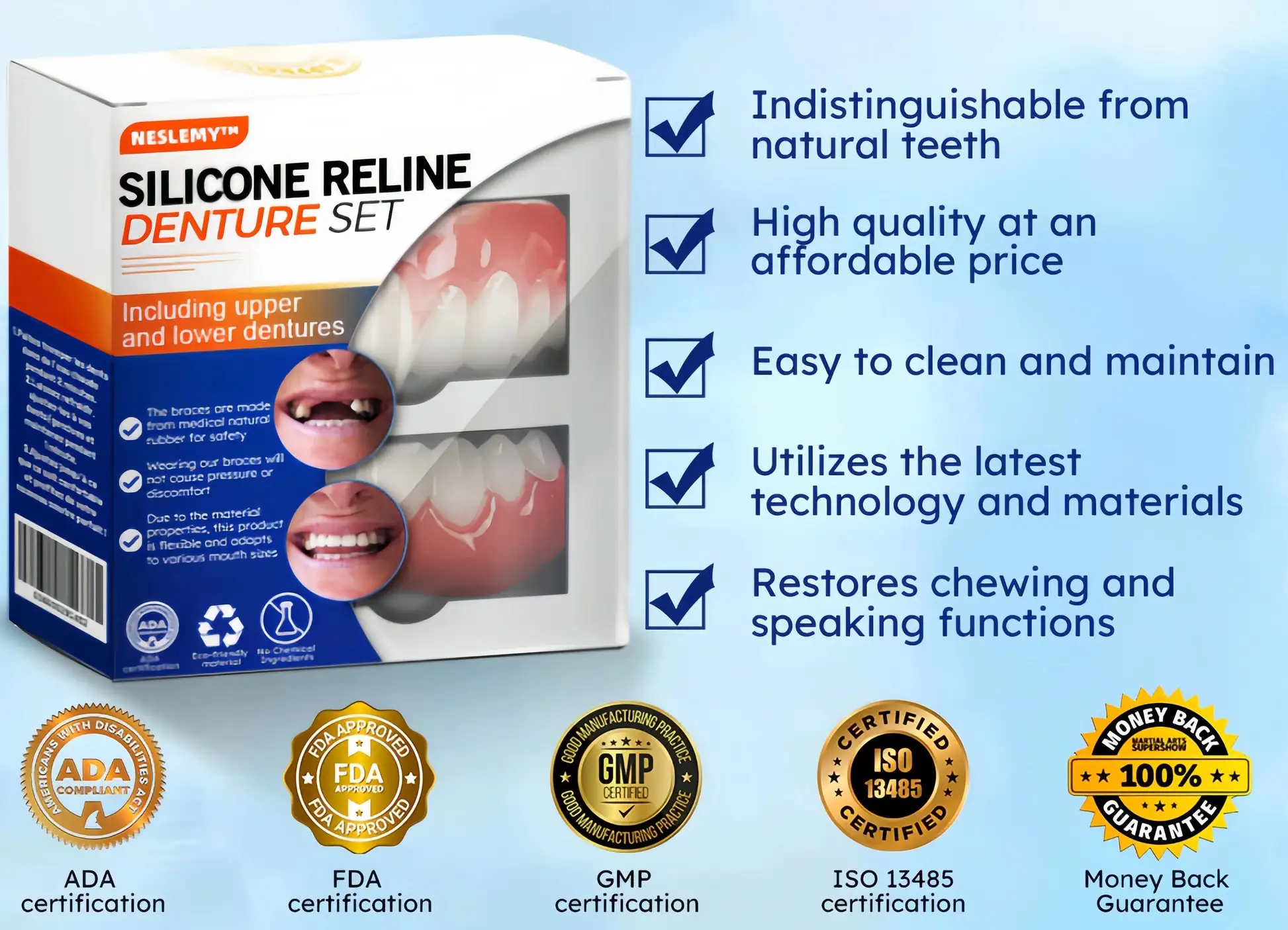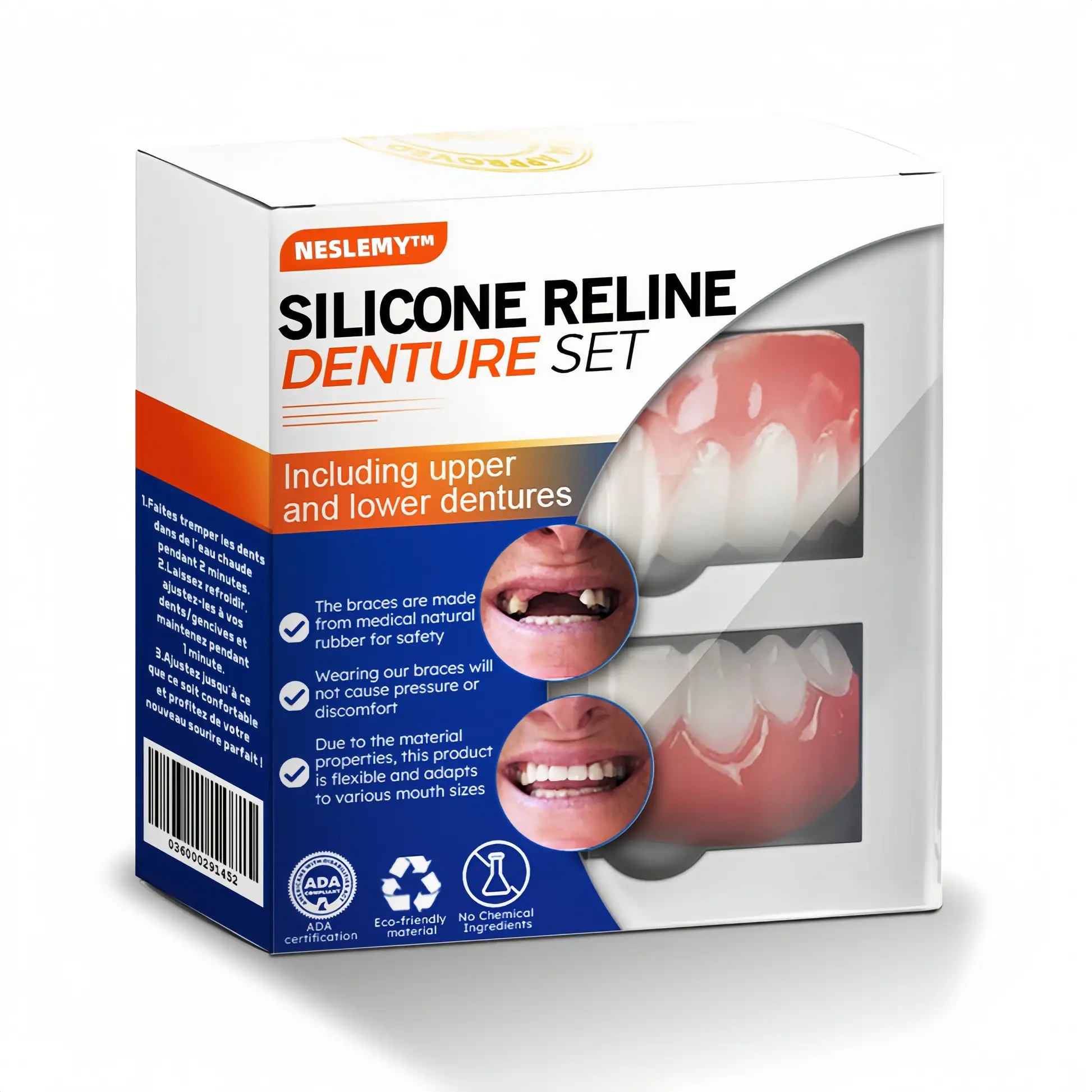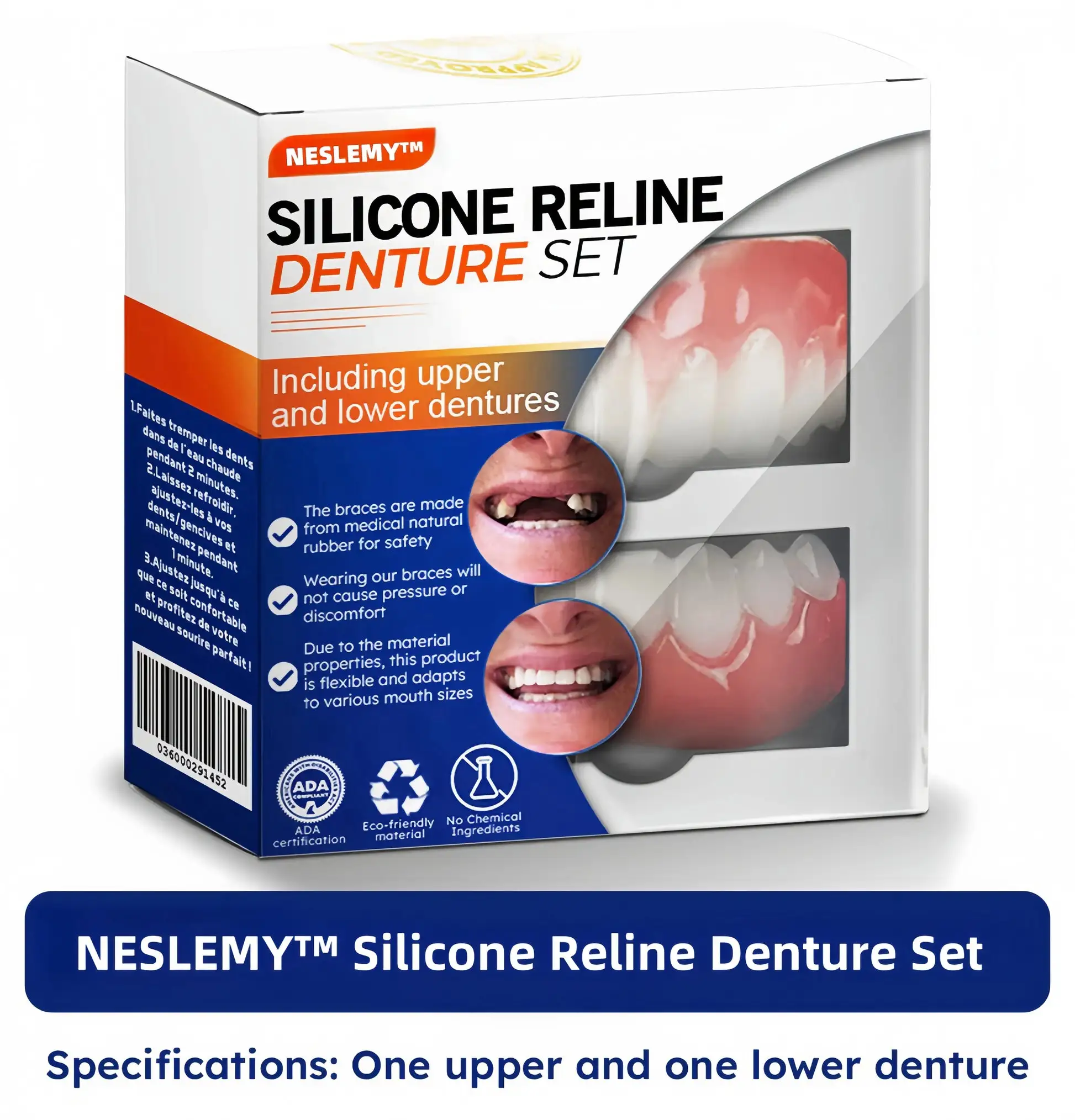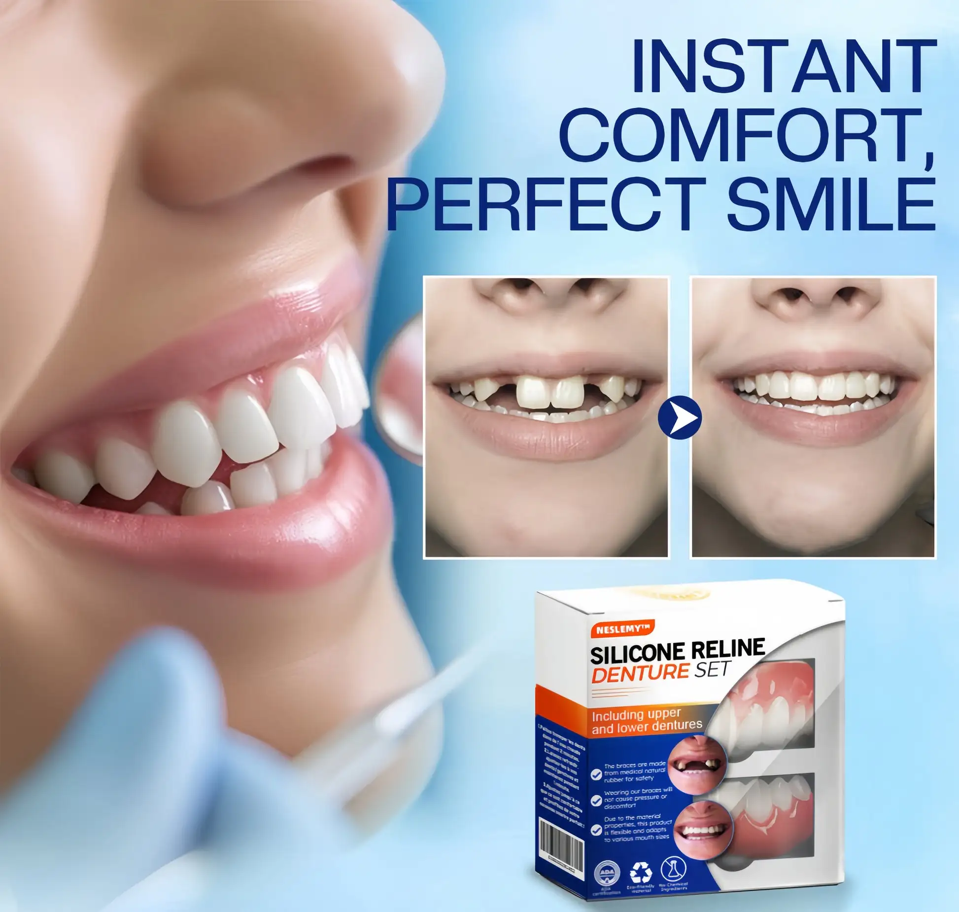 Welcome to NESLEMY™ Silicone Reline Denture Set, where cutting-edge dental innovation meets affordability. Our product offers you professional-grade dentures that look and feel just like the real thing, but without the hefty price tag. Transform your smile and regain your confidence with our easy-to-use, high-quality denture set.