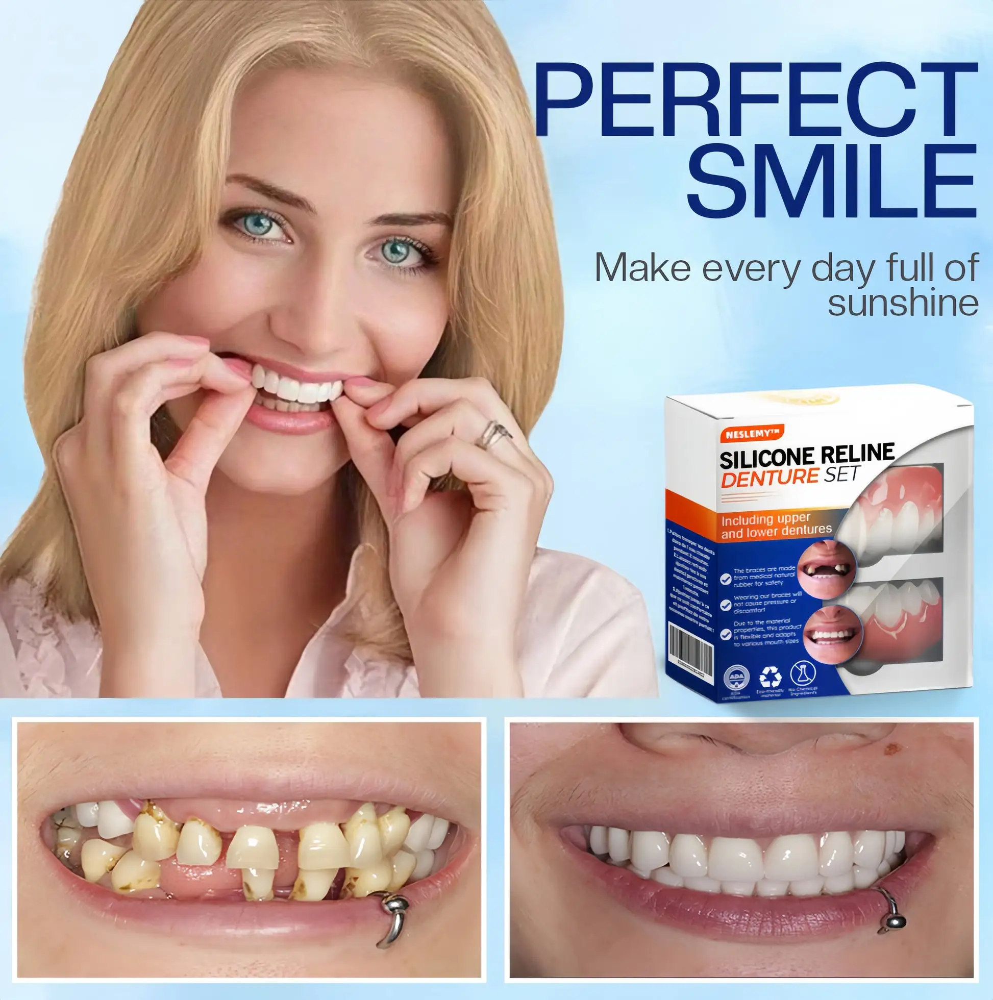 Do you ever feel self-conscious about your smile or crooked teeth? There is no need to go to the dentist for a pricey treatment! The NESLEMY™ Silicone Reline Denture Set offers a cost-effective solution for achieving the perfect smile.