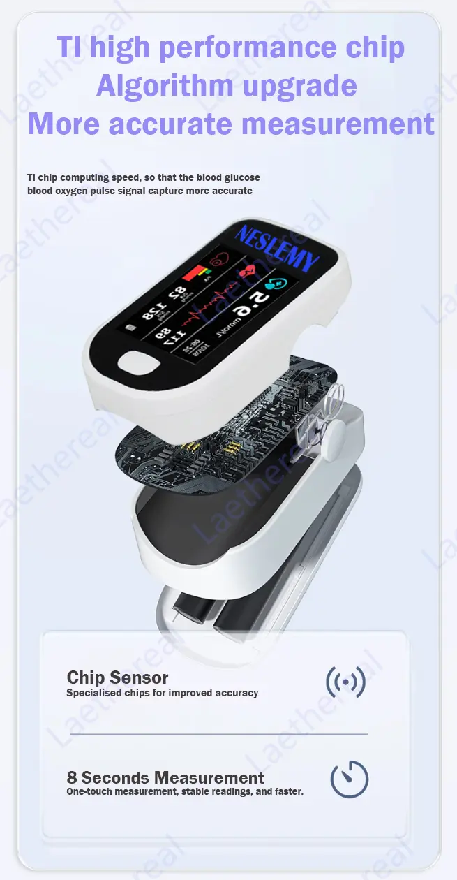 Completely painless – just place your index finger on the Neslemy™ and it will display your blood glucose level, oxygen level and even your heart rate in 8 seconds. Quick and easy!