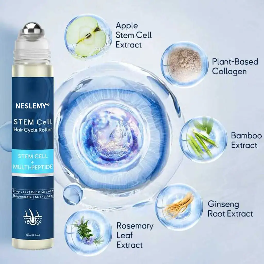 Not all hair regrowth formulas are created equal. NESLEMY® STEM Cell Hair Cycle Roller uses a pharmaceutical-grade complex of Apple Stem Cell Extract, NASA-inspired Multi-Peptides, and botanicals such as Bamboo, Ginseng, and Rosemary — concentrated and purified for maximum follicle activation.