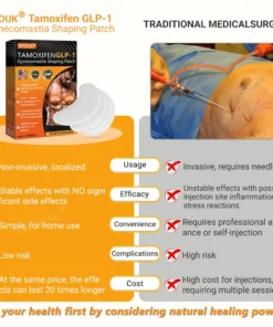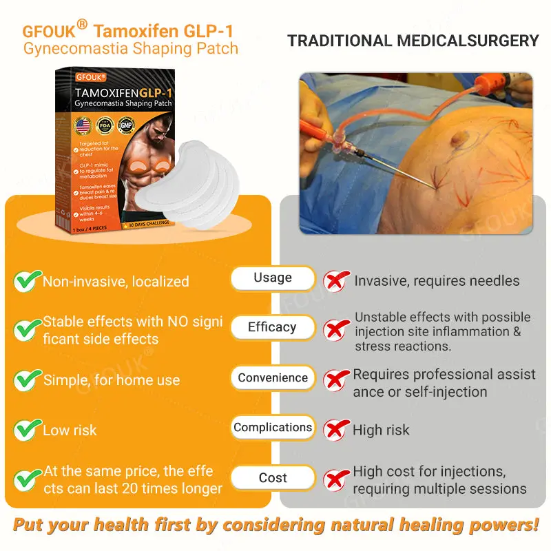 Choosing the GFOUK® Tamoxifen GLP-1 Gynecomastia Shaping Patch offers a convenient, non-invasive, and cost-effective solution for reducing chest fat. Unlike injections, which require professional assistance, cause discomfort, and can result in higher costs and potential side effects, our patch is simple to use at home with minimal risk. It targets specific areas gradually, ensuring a smooth and consistent effect without the pain or complications associated with needle-based treatments. With Timilk®, you can achieve a firmer, healthier chest contour with ease, comfort, and confidence.