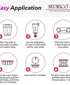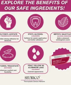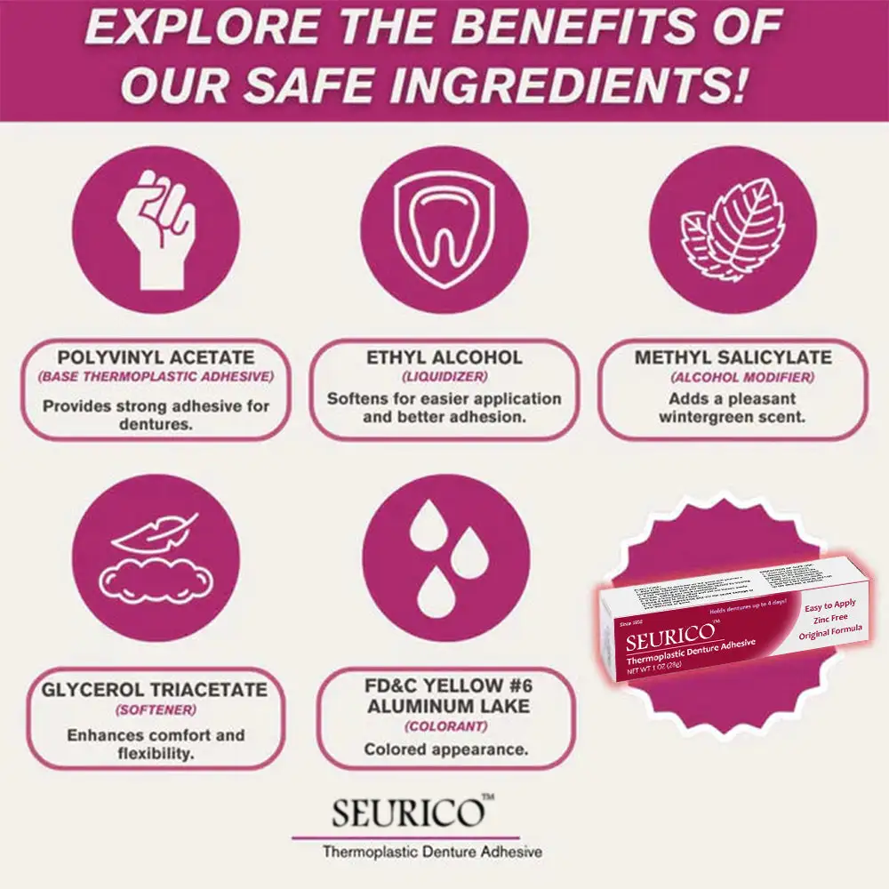 A proper denture adhesive is crucial for overall oral health and comfort. When dentures do not stay in place, they can cause pressure sores and inflammation. The Seurico™ Thermoplastic Denture Adhesive addresses these issues by providing a strong bond that enhances the stability and comfort of your dentures, allowing you to enjoy daily activities without pain.