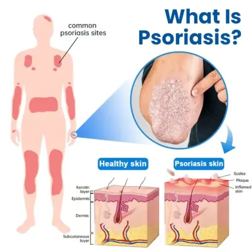 Psoriasis is a chronic autoimmune disease where the immune system mistakenly attacks normal, healthy skin cells, leading to excessive growth, accumulation, scaling, and redness. This condition can manifest in various forms throughout the body, causing blisters and sweat rash on sensitive areas, intense itching and cracked skin that bleeds easily, contact dermatitis-like reactions to everyday triggers, severe peeling on hands and feet that affects daily activities, classic psoriasis plaques with thick, scaly patches, and heat rash symptoms that worsen in warm conditions.