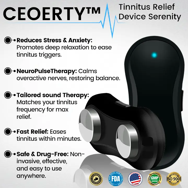 The Ceoerty™ Tinnitus Relief Device Serenity is a breakthrough solution designed to effectively reduce tinnitus symptoms using advanced NeuroPulse Therapy. This cutting-edge technology targets overactive auditory nerve signals, rebalancing brain activity to restore natural sound perception. By delivering precise neuro-modulating pulses and tailored sound frequencies, Ceoerty™ helps retrain the brain to ignore tinnitus, providing both immediate relief and long-term improvement. Unlike conventional masking techniques, NeuroPulse Therapy works at the neurological level, addressing the root cause of tinnitus rather than just covering up the symptoms. With consistent use, Ceoerty™ can significantly reduce the intensity and frequency of tinnitus, helping users regain peace, focus, and control over their auditory health.