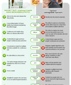 The NESLEMY® Tirzepatide Nano Microneedle Patch offers a long-lasting. slow release of the medication. ensuring a stable effect over 24 hours without causing any discomfort. With the same dosage and price. it can maintain up to 20 times longer-lasting effects (similar to the difference between an IV drip and a single injection).