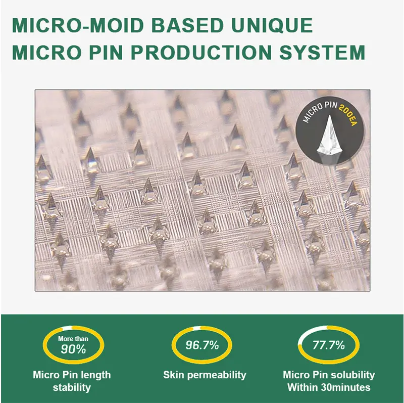 Each needle is 0.27mm long. just 1/7th the thickness of a hair. and is made from dissolvable medication. These micro-needles are precision-engineered using cutting-edge manufacturing techniques to ensure a seamless. pain-free experience while effectively delivering the active ingredients directly into the skin.