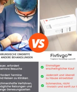 Im Gegensatz zu herkömmlichen Hautpflegebehandlungen, die teure Eingriffe, schmerzhafte Operationen oder unwirksame Cremes erfordern, ist der Fivfivgo™ Tragbare Hautpflege-Laserstift einfach zu verwenden und liefert professionelle Ergebnisse bequem von zu Hause aus. Keine Termine oder kostspieligen Dermatologiebesuche erforderlich – nur wenige Minuten am Tag für eine makellose Haut!