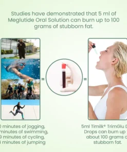 Studies have demonstrated that 5 ml of Meglutide Oral Solution can burn up to 100 grams of stubborn fat. In comparison, it would take much longer to burn 50 grams of fat through exercise—around 80 minutes of jogging, 92 minutes of swimming, 119 minutes of cycling, or 64 minutes of jumping rope.