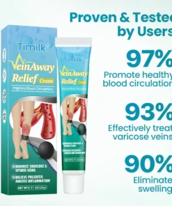 Timilk® VeinAway Relief Cream is a doctor-formulated topical solution designed to help reduce the appearance of varicose and spider veins, boost circulation, and relieve swelling and leg fatigue.
