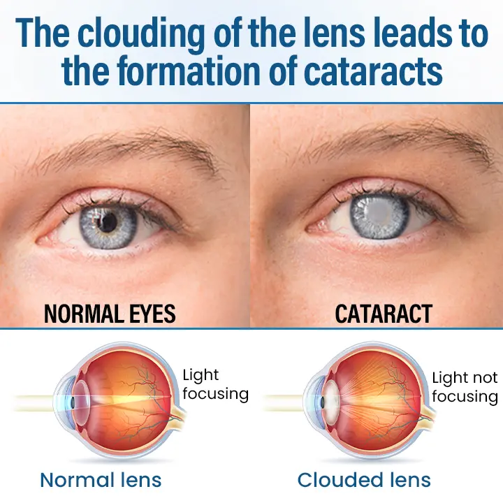 Cataracts: Protein clumps form in the lens, creating a “white haze” that makes the world blurry.