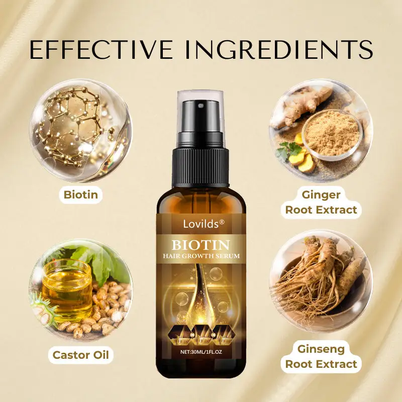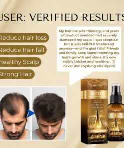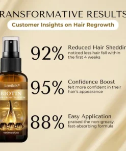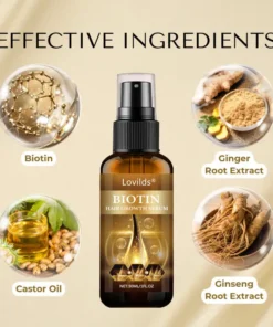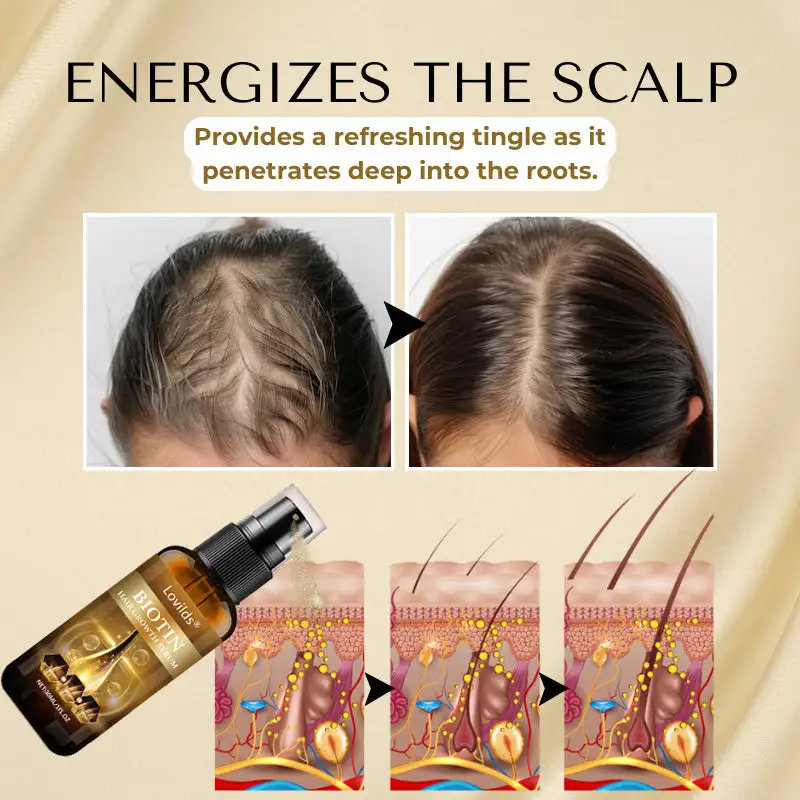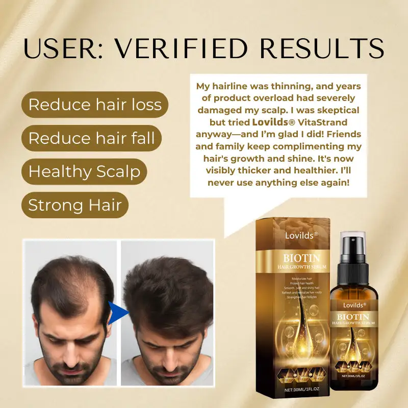 Discover the perfect harmony of nature and innovation in every mist of Lovilds® VitaStrand Biotin Hair Growth Spray—your go-to solution for hair loss and the secret to achieving visibly fuller, shinier, and healthier hair. This cutting-edge formula, powered by the restorative force of Biotin, is designed to breathe life back into thinning, lackluster hair, transforming it into your most stunning feature. Reclaim your confidence with every spray and turn your hair into your crowning glory.